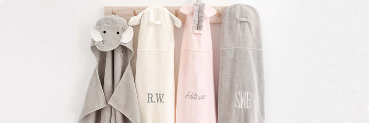 Make bath time a favorite part of a child’s day with a personalized baby hooded towel from Elegant Baby. We offer a snuggle-ready selection of monogrammed baby hooded towels that will delight parents and babies alike. Designed of supersoft cotton velour terry, our embroidered baby hooded towels feature a playful animal hood and tail that will spark a child’s imagination as they dry off after a bath. Ideal for little girls or boys, our adorable animal hooded bath towels include cuddly puppies, lambs, bunnies, elephants, sea serpents, sharks and hippos. If you opt to make your gift a personalized bath wrap, the baby’s name, monogram or initials will be embroidered on the outside of the towel, just below the hood.