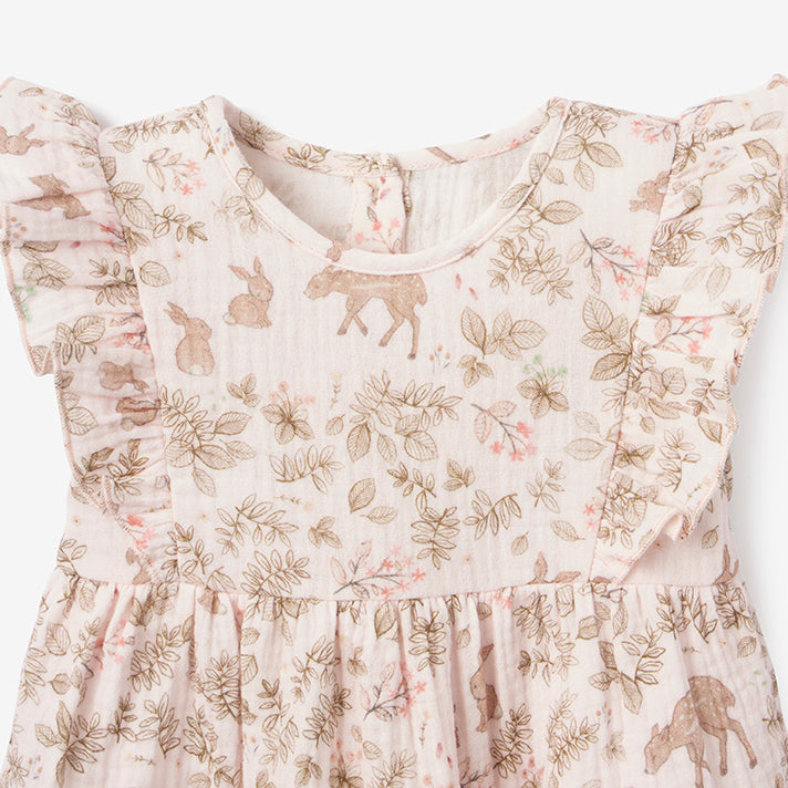 Our Woodland Print Organic Muslin Bubble Baby Romper is perfect for any on-the-go baby. Made of 100% GOTS-certified organic cotton, this precious baby romper is cool for warmer months, soft and gives baby plenty of room to move. Little details like delicate fluttered sleeves, elastic leg opening, pleated waist and snap closures at back and crotch make this bubble baby romper as functional as it is stylish. We deliver this romper with a wooden hanger. Make the outfit extra special and functional by pairing it with one of our signature cardigans or add our Swirl Fawn Bedtime Huggie Plush Toy for the perfect baby gift set.