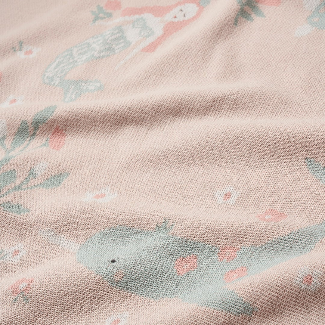 Elegant Baby is known for our signature jacquard knit baby blankets, and our pink Mermaid Sea Magic Cotton Knit Baby Blanket is surely a favorite! Made with a mid-weight 100% cotton jacquard knit, our mermaid baby blanket features a dreamy mermaid and undersea pattern. Durable and machine washable, it makes the perfect baby gift. Pair it with our Ocean Adventure Organic Muslin Tie Top Set or Mermaid Knit Toy to create a one-of-a-kind gift. We offer a range of knit baby blankets to choose from so you can match to baby's nursery.