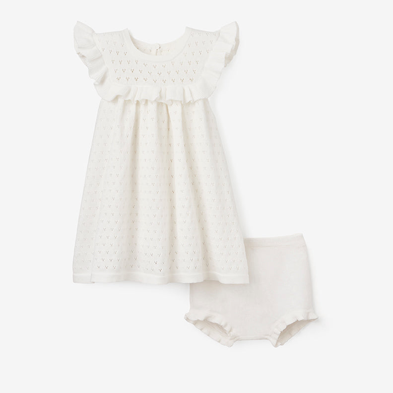 White Pointelle Flutter Sleeve Knit Baby Dress