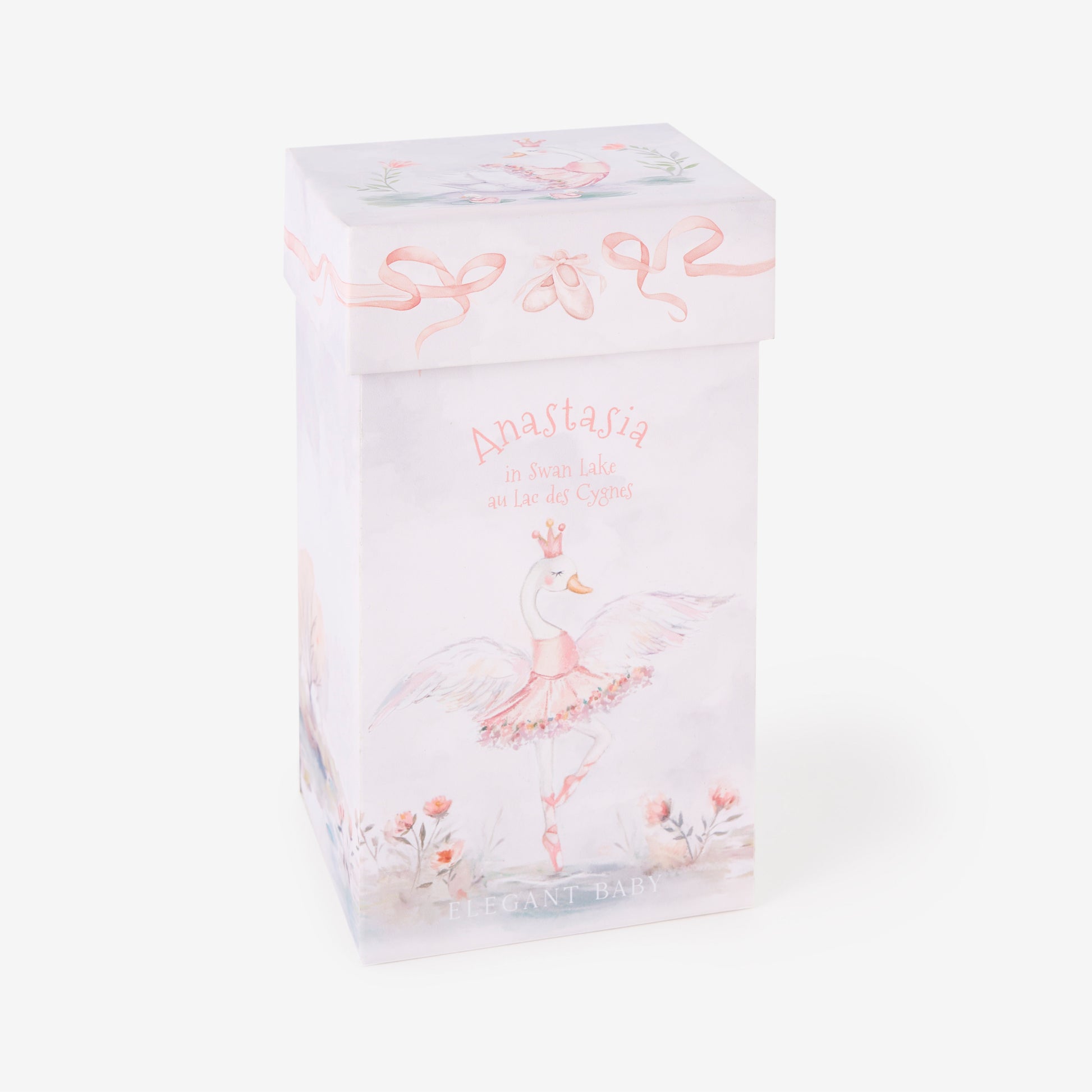 Anastasia the Ballerina Swan is a vision of grace, adorned with delicate details that inspire dreams of pirouettes and grand jetés. Nestled in a hand-illustrated gift box, she's a timeless keepsake for little dancers and plush collectors alike.