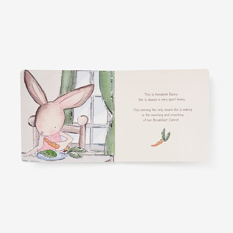 The Quiet Bunny Board Book is an endearing story of Annabelle, a quiet bunny who sets out to find a birthday gift for her friend, the mailman…and all the woodland friends she meets along the way. It's a sturdy and heartwarming book to give as a gift for new babies, showers, and birthdays. An Elegant Baby exclusive, written and illustrated by Joseph Cudd.