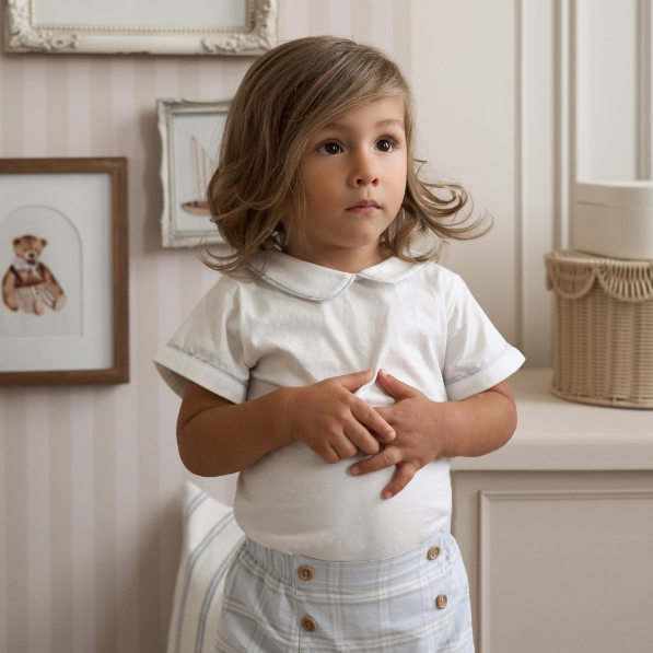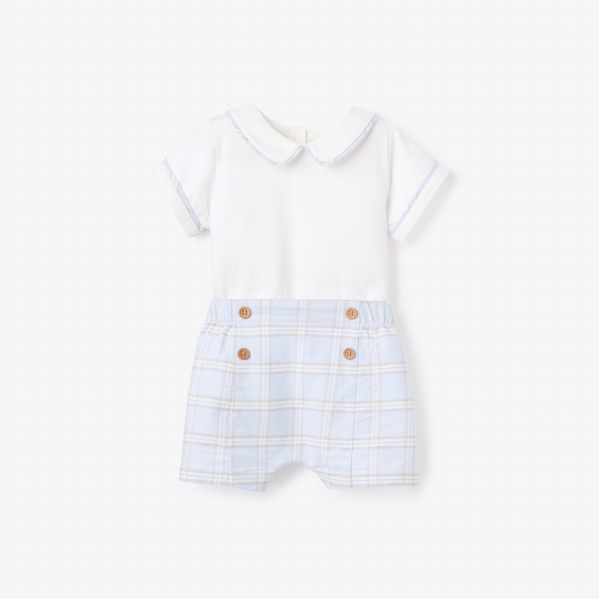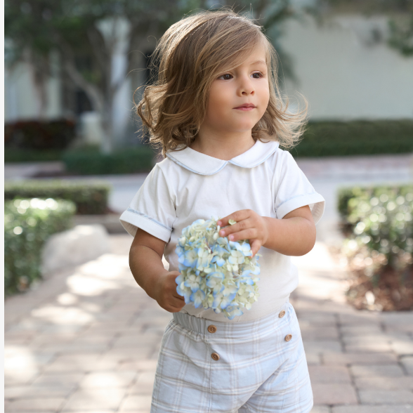 A refined take on a seasonless favorite, this set pairs the iconic blue grey plaid with a crisp trimmed collar bodysuit. Polished yet approachable, it's perfect for Easter celebrations and spring occasions big and small. Designed to be monogrammed — a quiet detail that makes it theirs.