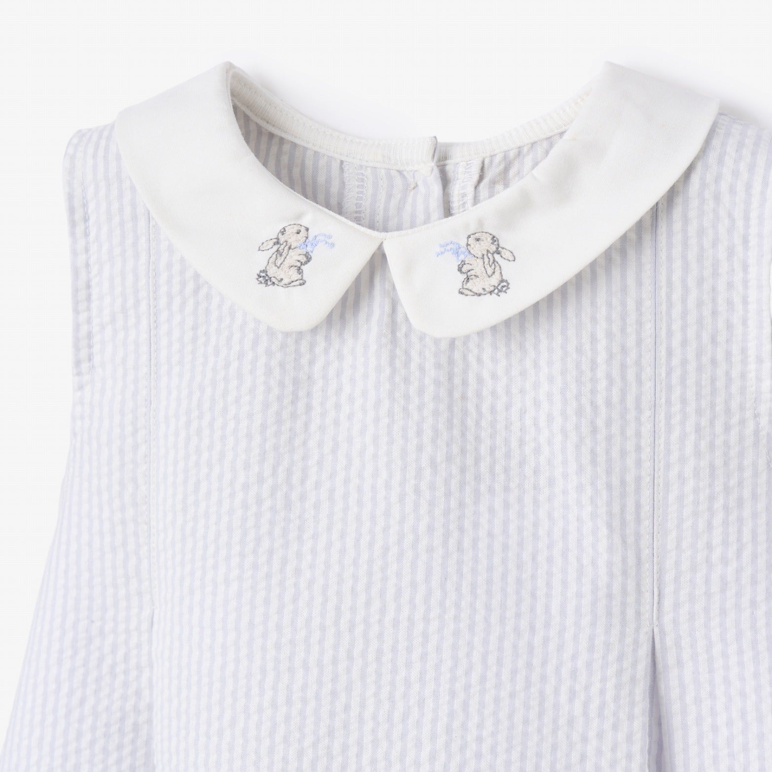 A soft nod to Easter tradition, this charming dress features delicate bunny embroidery set against classic blue seersucker. Designed for meaningful spring moments, it's a piece made for family gatherings and timeless portraits.