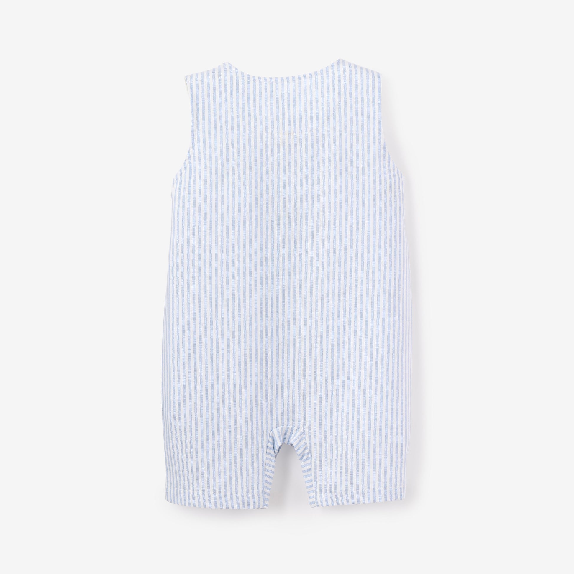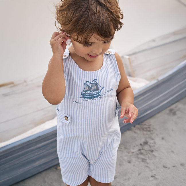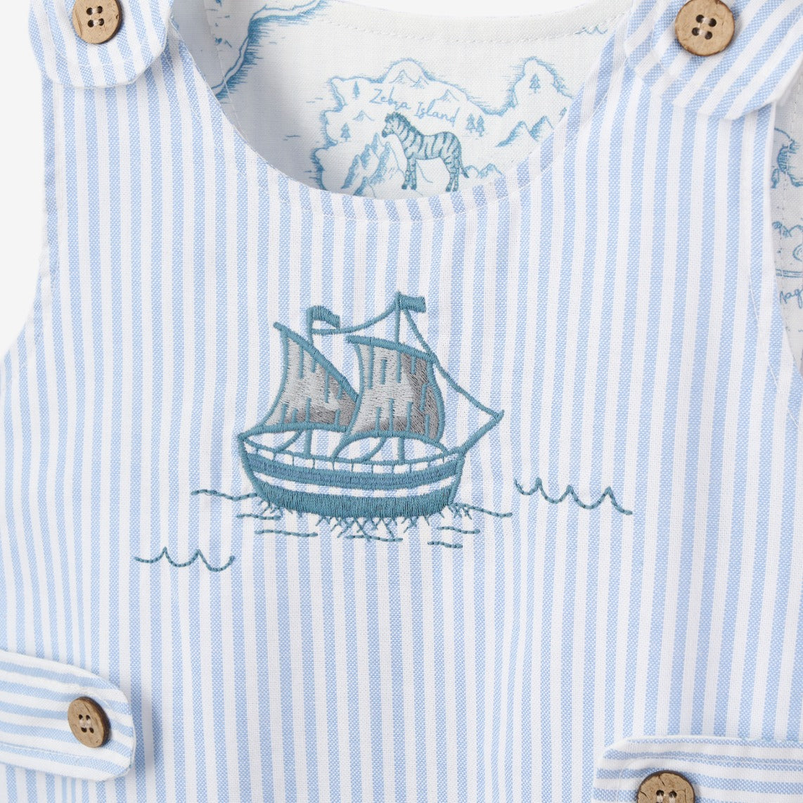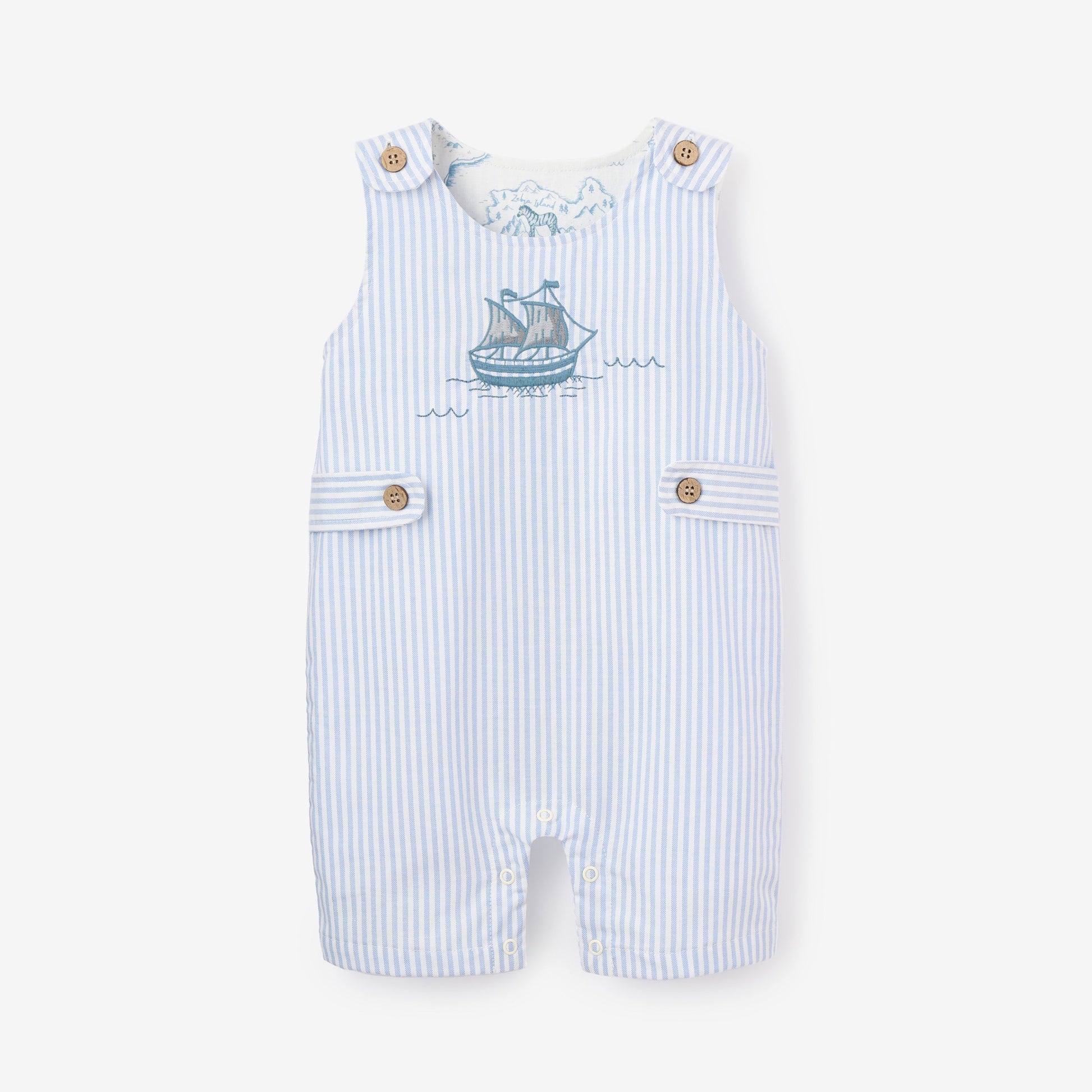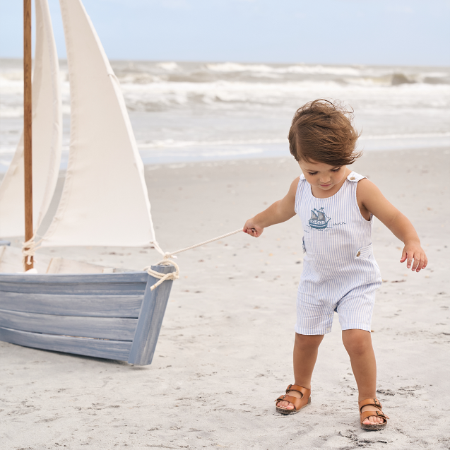 This sailboat-embroidered oxford stripe Jon Jon is the epitome of classic baby boy style—breezy, comfortable, and effortlessly polished. Perfect for seaside strolls or special occasions, it's a timeless staple for a Vineyard or Hamptons-inspired wardrobe.