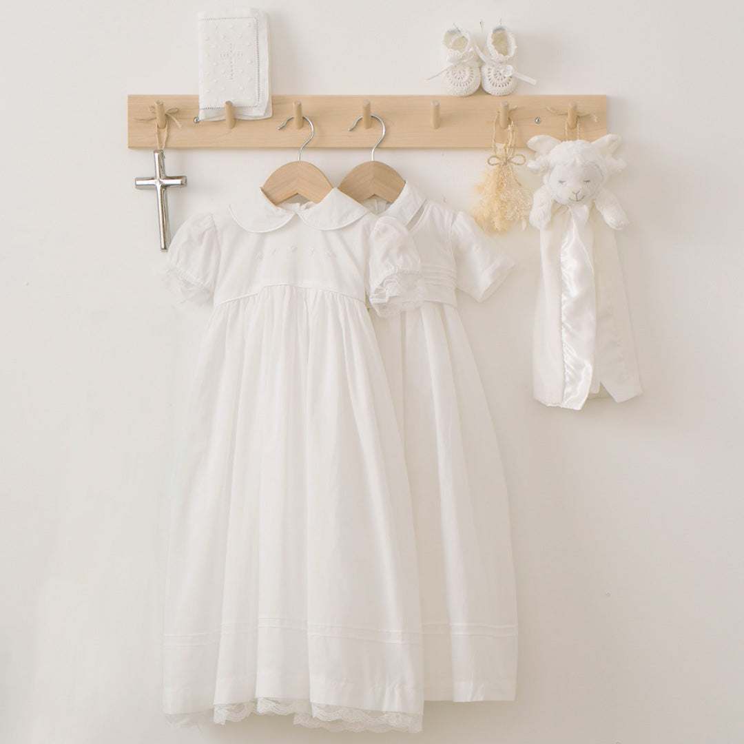 This heirloom quality Christening gown is a beautiful keepsake that can be handed down for generations. Made from soft 100% cotton voile with beautiful embroidery details and pin tucking. Perfect for Christening day, the gown comes with matching bonnet and is presented on a padded hanger with a protective organza bag.