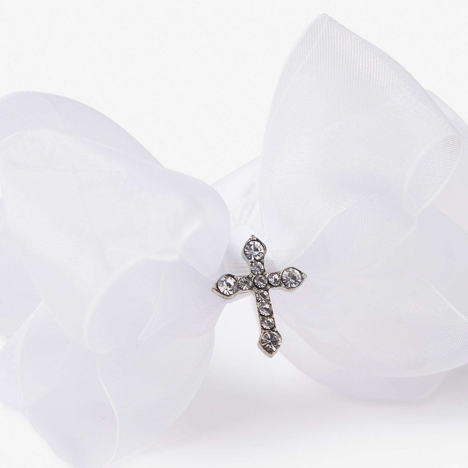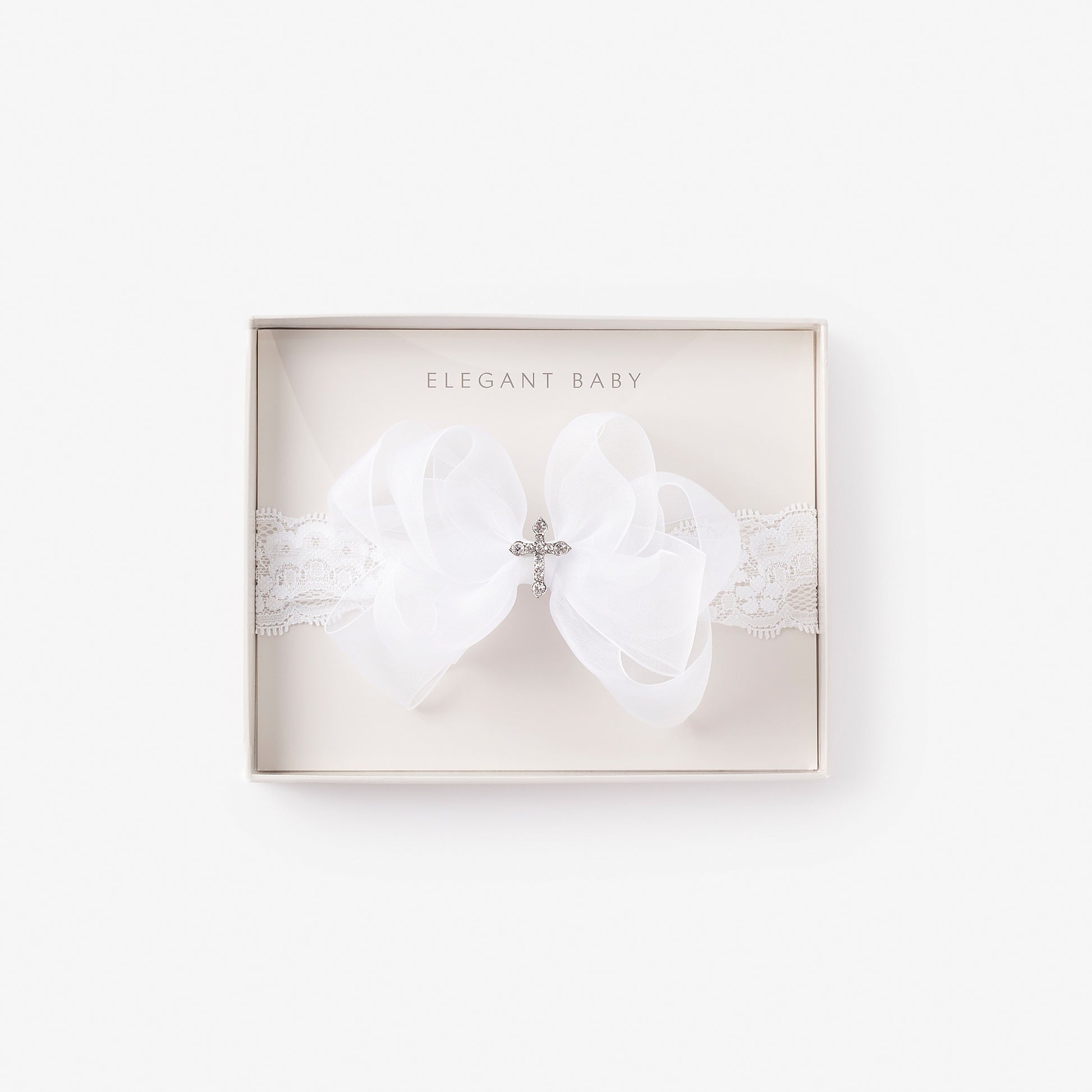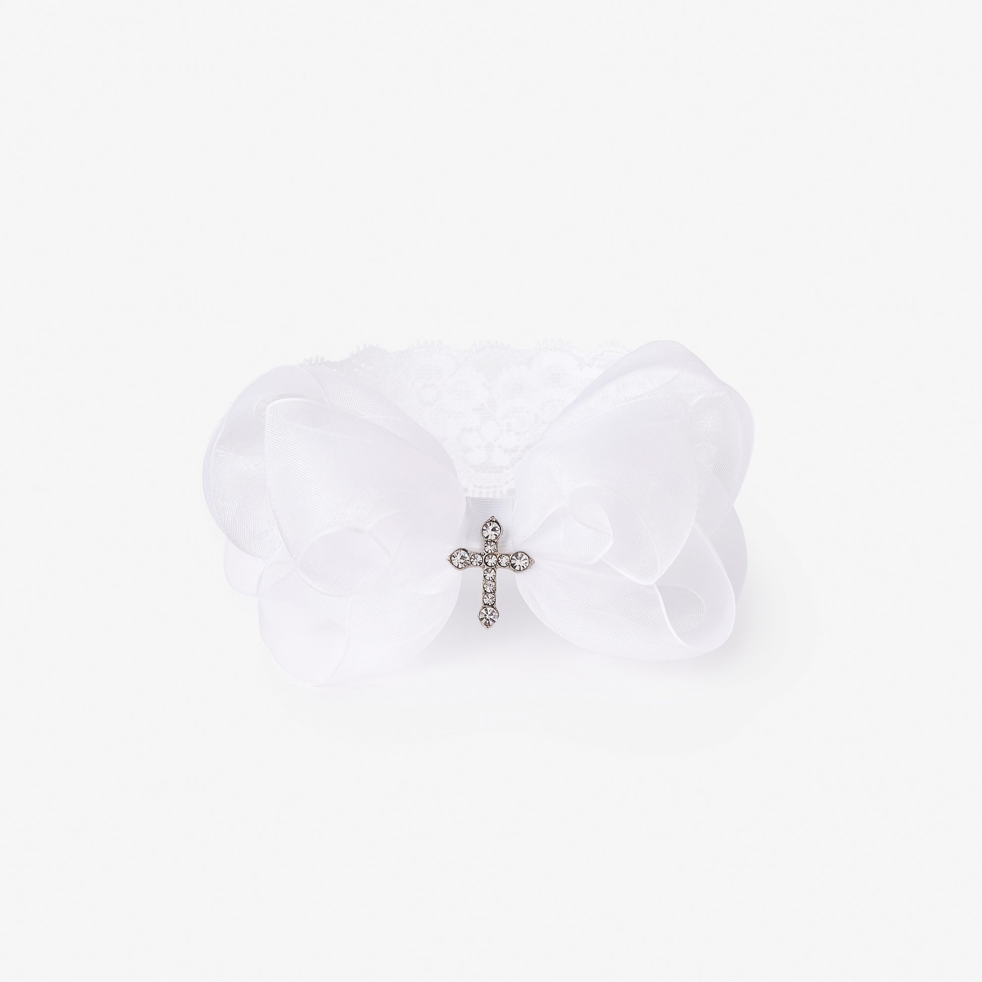 The cross christening headband is the perfect hair accessory when your little angel is dressed in her Sunday best. The soft, stretchy lace headband has a satin-trimmed tulle bow that accentuates a silver cross lined with clear rhinestones. Perfect for christenings, church services and even casual daily wear. Make sure to check out the rest of our Christening Collection for matching outfits and accessories!
