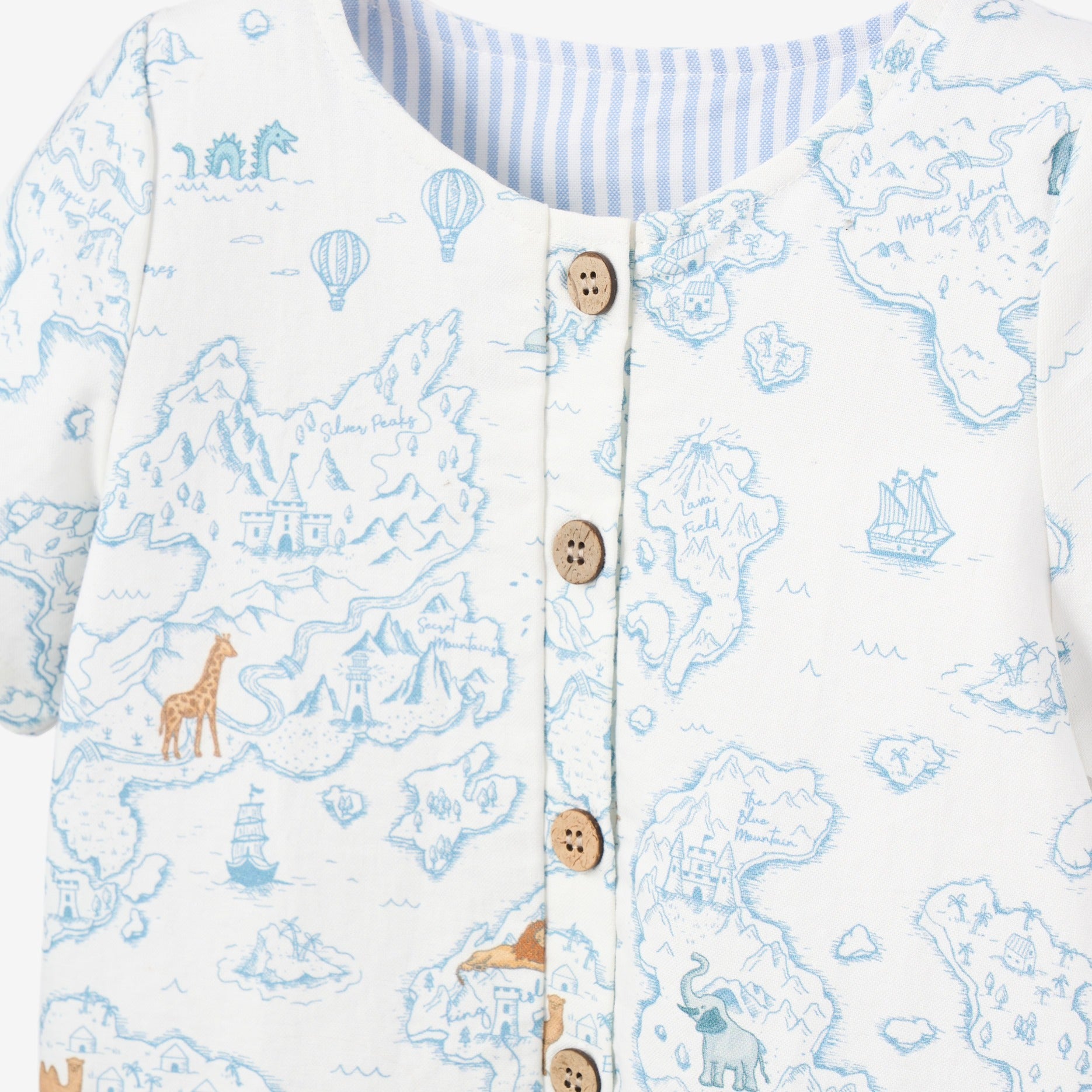 For little explorers with big adventures ahead, this short-sleeve button-down shortall features a charming antique map print. Crafted from soft cotton with classic oxford stripe details, it's a timeless look for discovering the world in style.