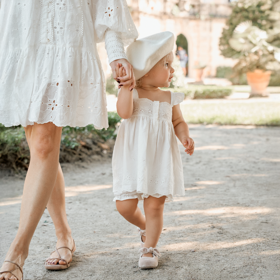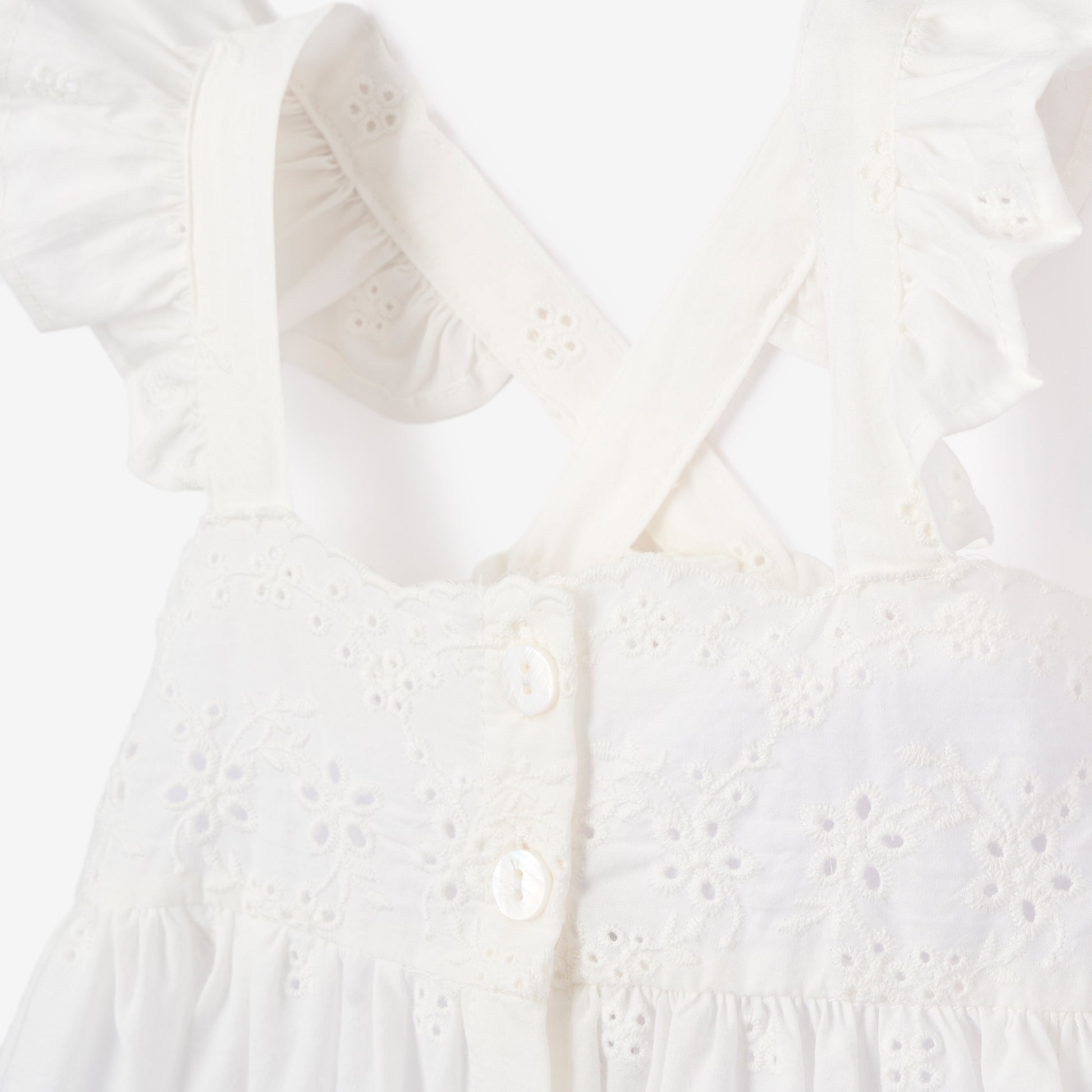 A vintage-inspired treasure, this eyelet lace dress features a scalloped hem, delicate cross-back straps, and a classic button front. Crafted from 100% breathable cotton with a matching bloomer, it's a timeless choice for warm days.