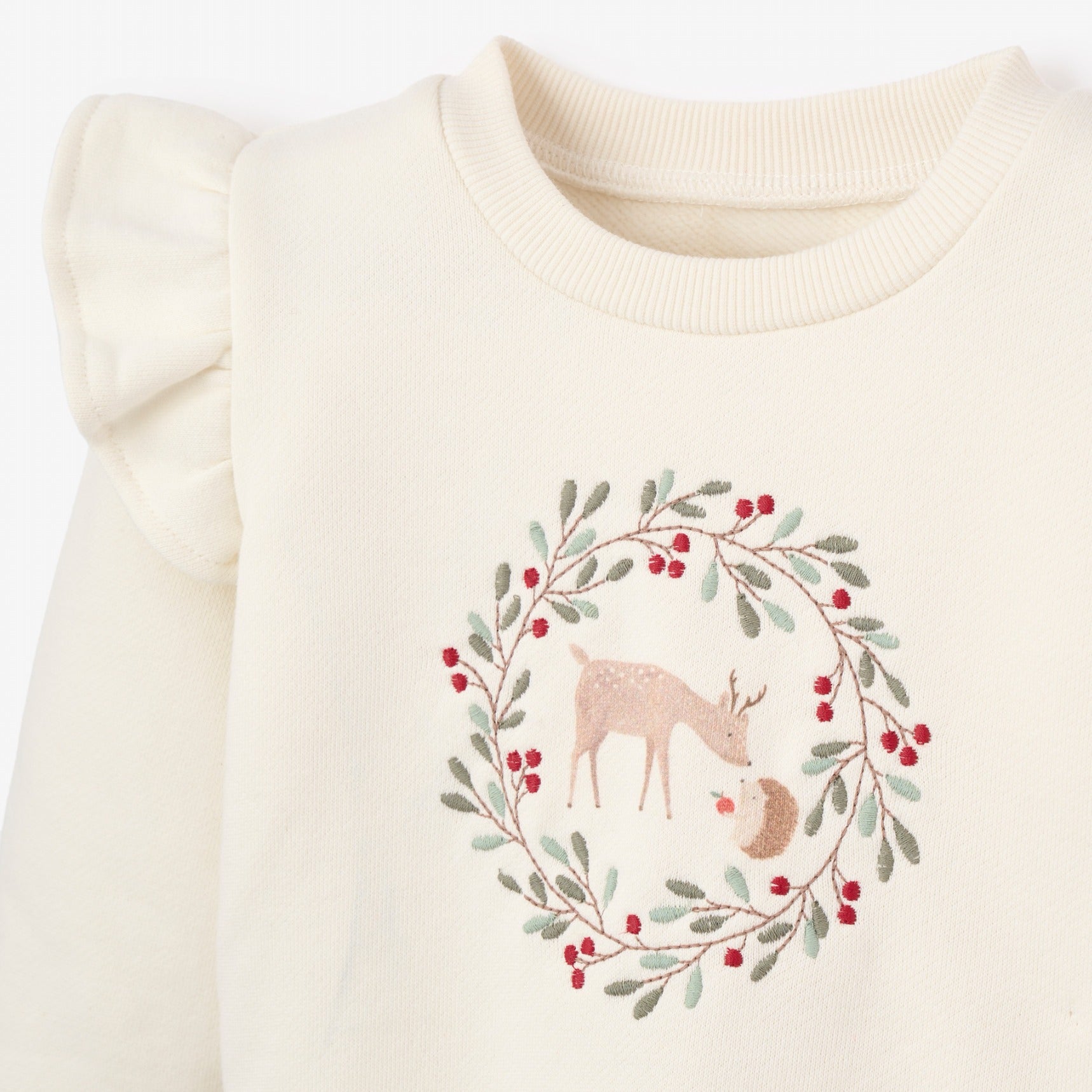 Delicately embroidered with festive forest scenes, this cozy fleece sweatshirt and pant set brings comfort and cheer to every winter day. A soft, seasonal staple with heirloom appeal.