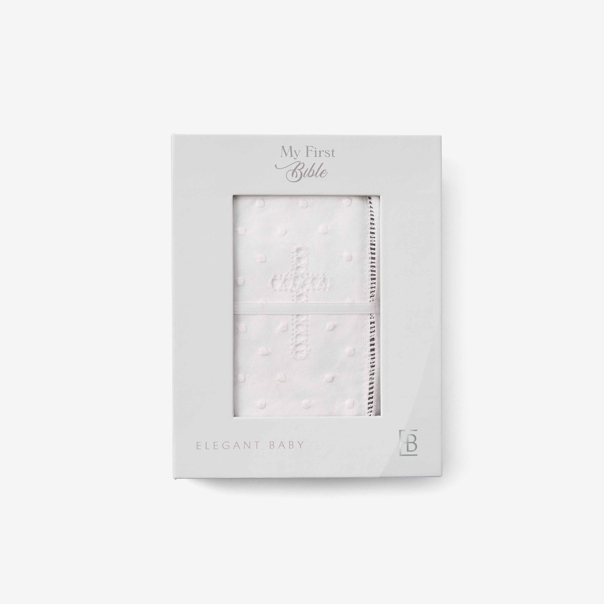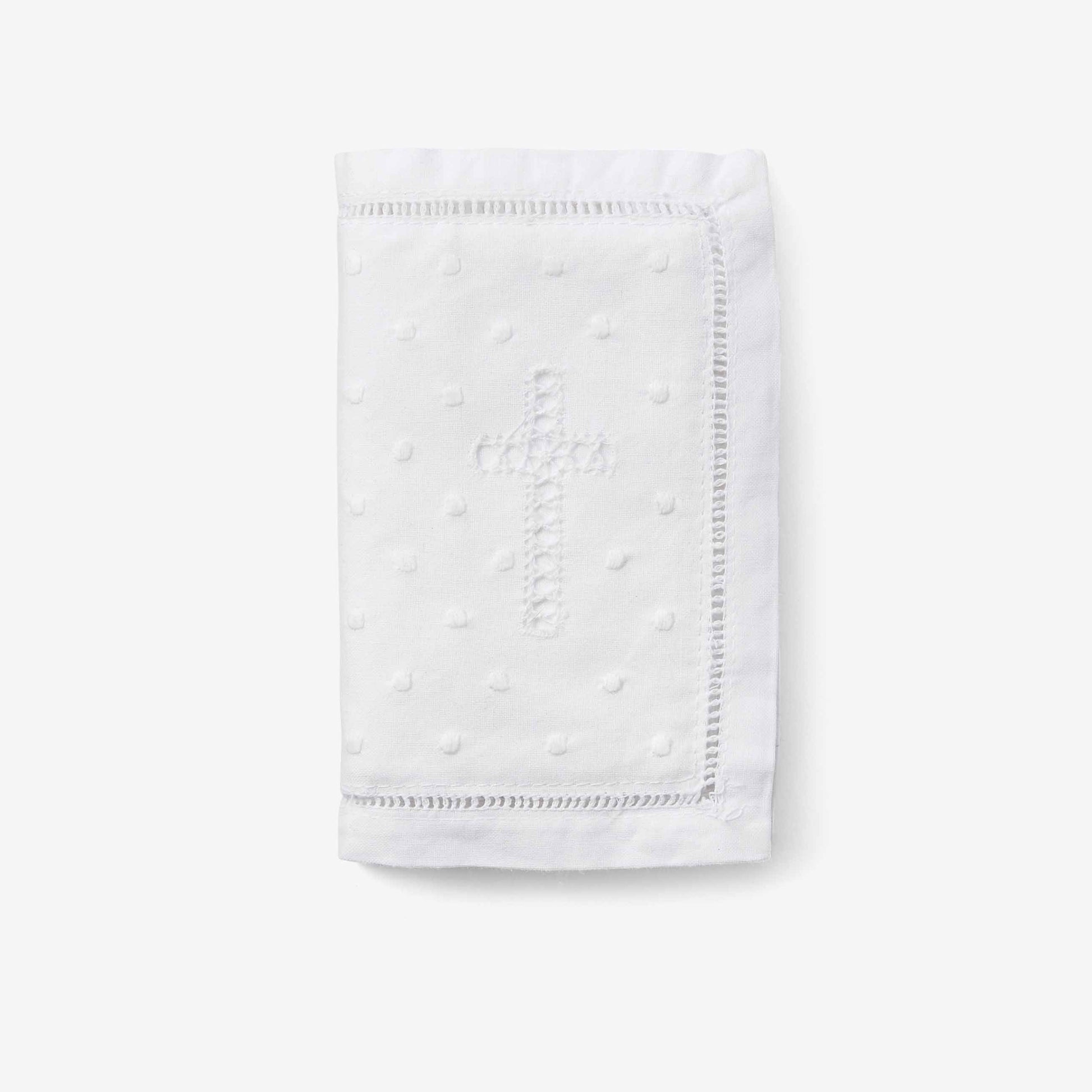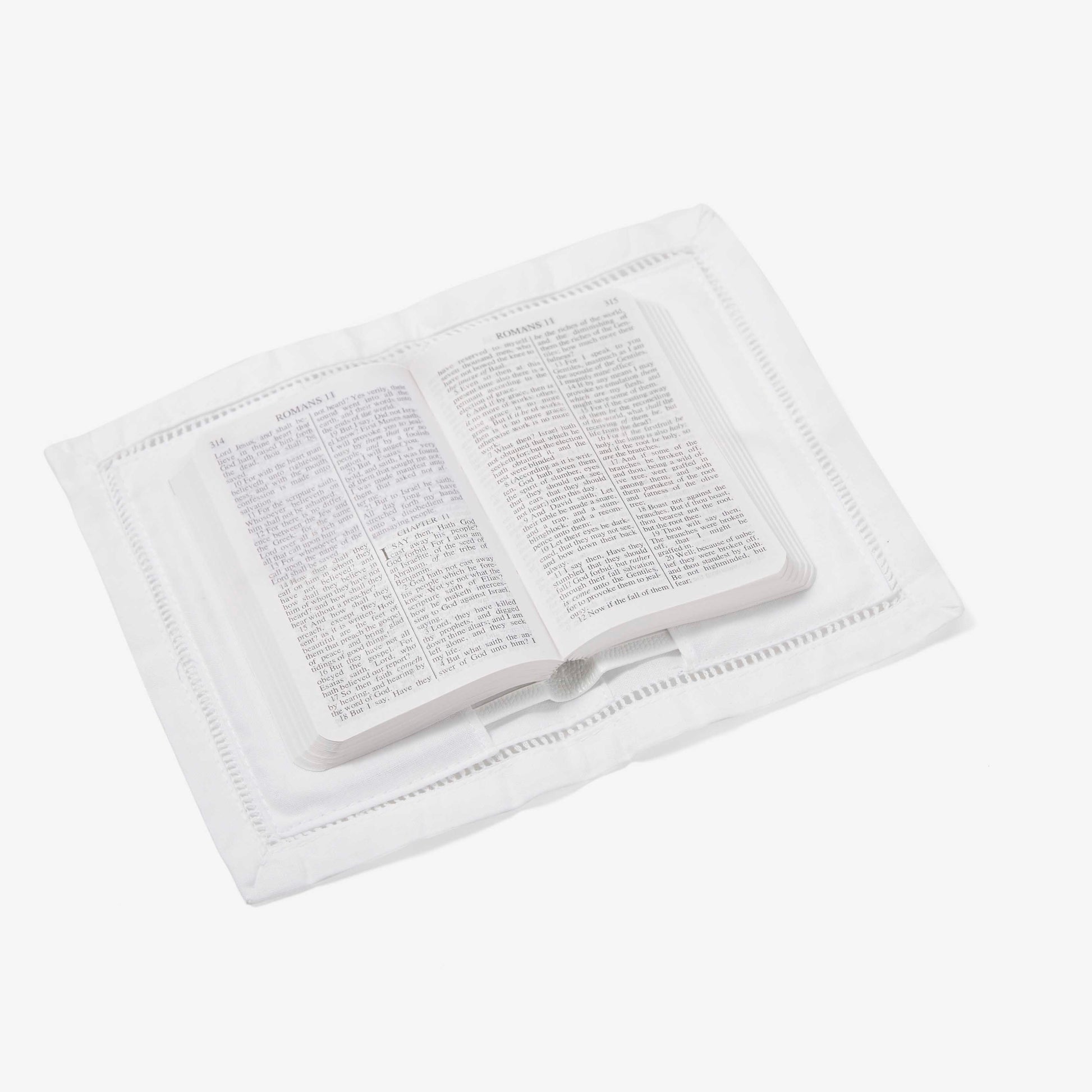 Bibles are one of the most cherished items in a person's home, always kept close on bedsides or dressers or bookshelves. This elegant Hand-embroidered Heirloom Bible Cover is particularly special because it is made to one day become part of a wedding bouquet when your little one grows to wed. A beautiful cross is stitched in the center of the cloth cover with a delicate lace trim.
