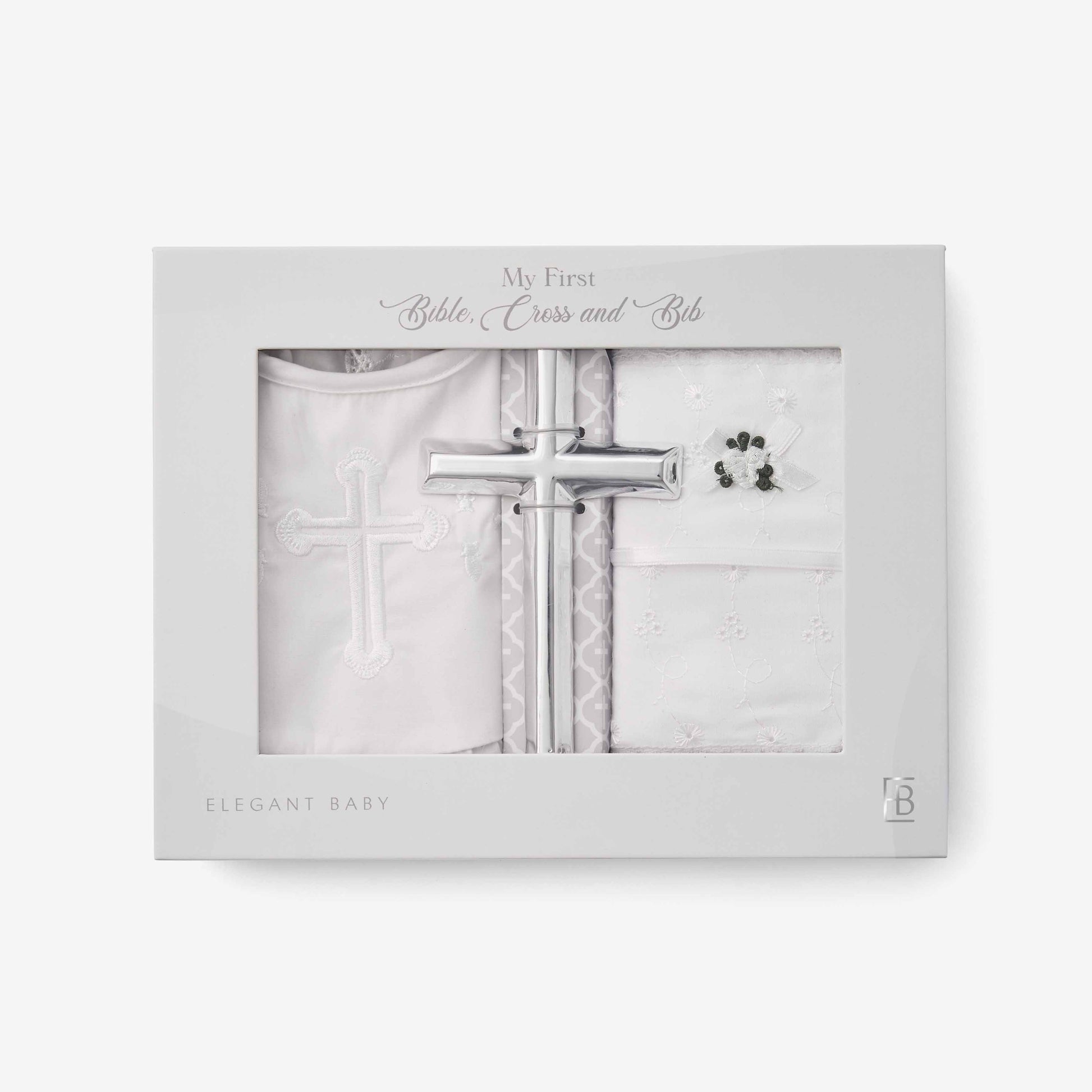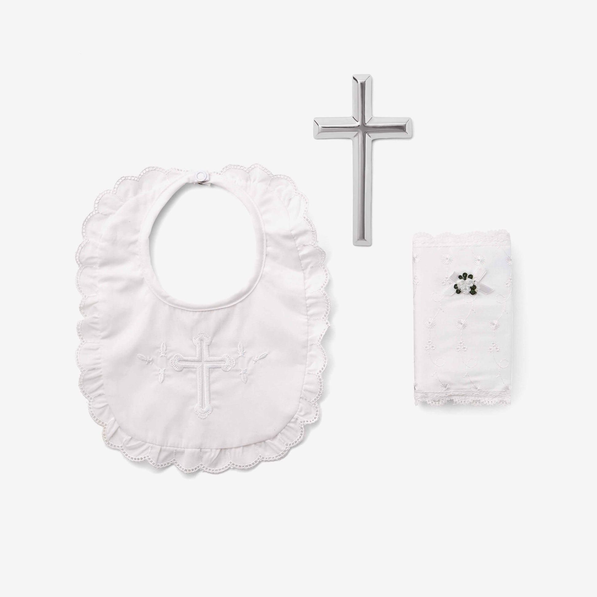 - Set includes eyelet lace covered New Testament Bible, Ruffle terry cloth bib with cross embroidery, and metallic silver ceramic keepsake cross