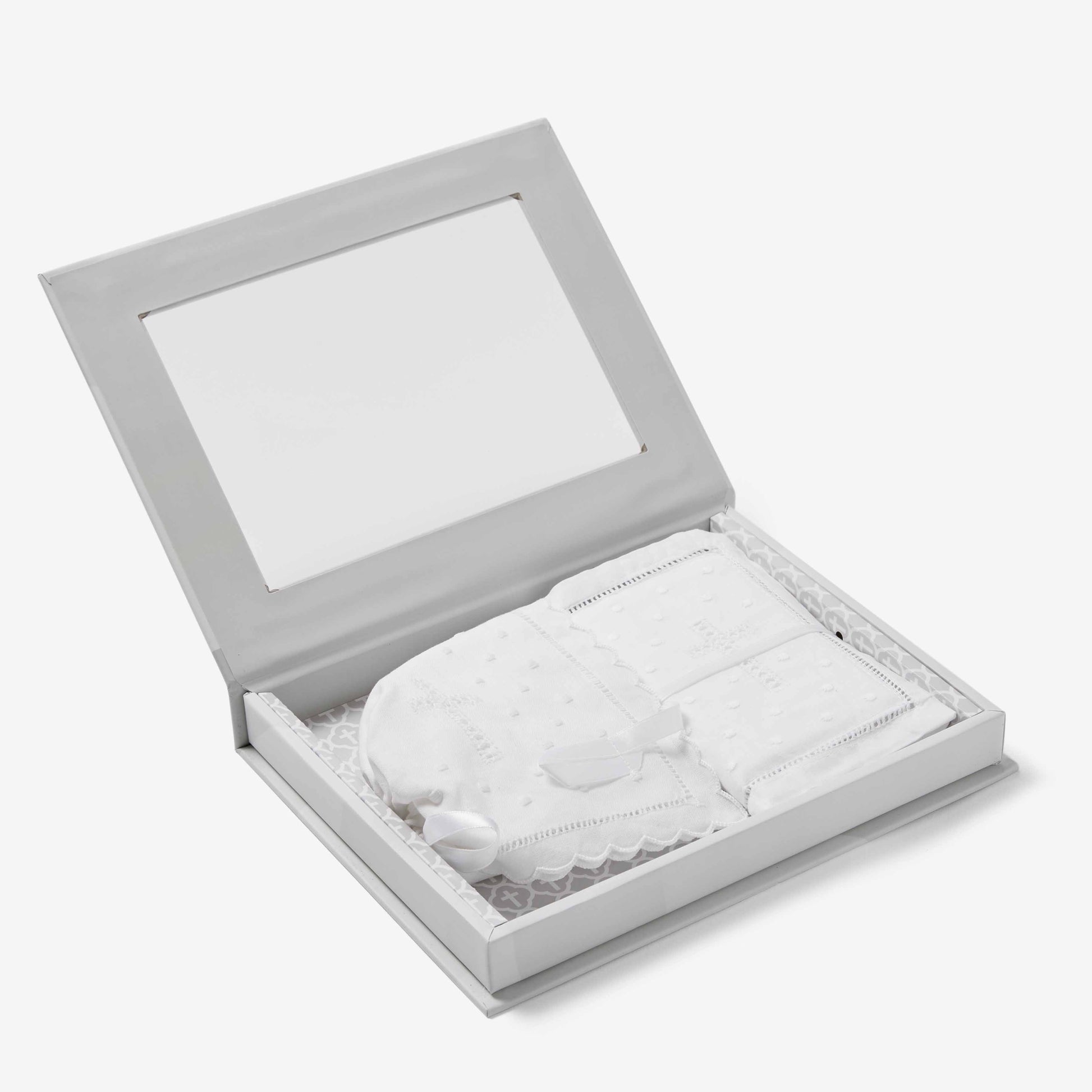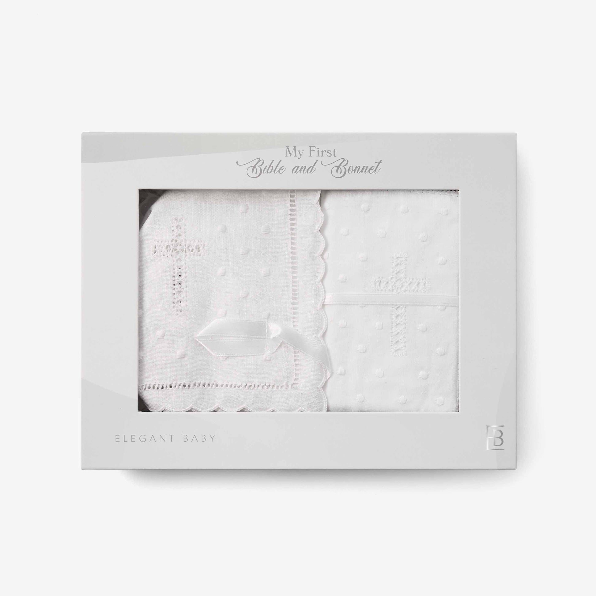 Here at Elegant Baby, we have been creating luxury Christening gifts for over 50 years--we consider them to be part of our heritage which is why we spare no detail when designing these baby milestone keepsakes. Presented in a beautiful baby gift box that reads 'My First Bible & Bonnet,' this beautifully designed heirloom set is the perfect luxury Christening gift for any baby girl or boy. Sweet swiss-dot cotton details further elevate this luxury Christening gift set while giving it a vintage, heirloom look with modern feel.