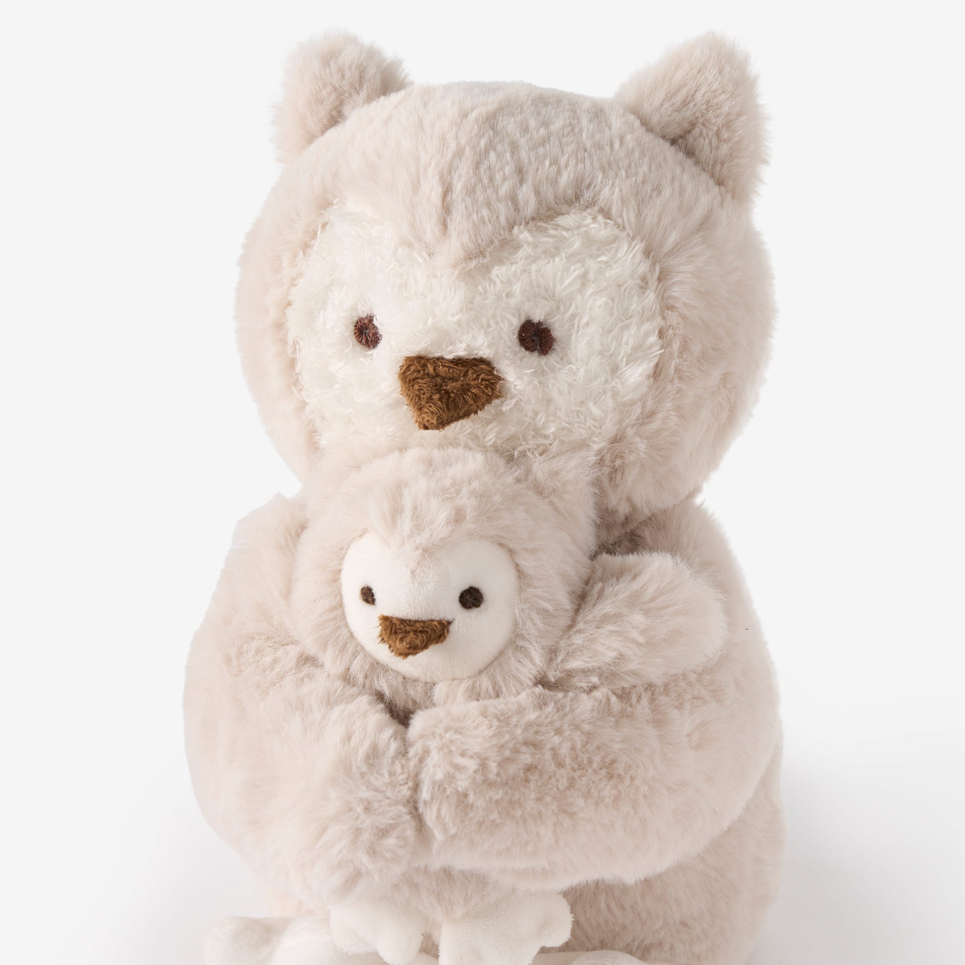 larger mom owl lovingly holding a smaller baby owl. The mother owl's velcro