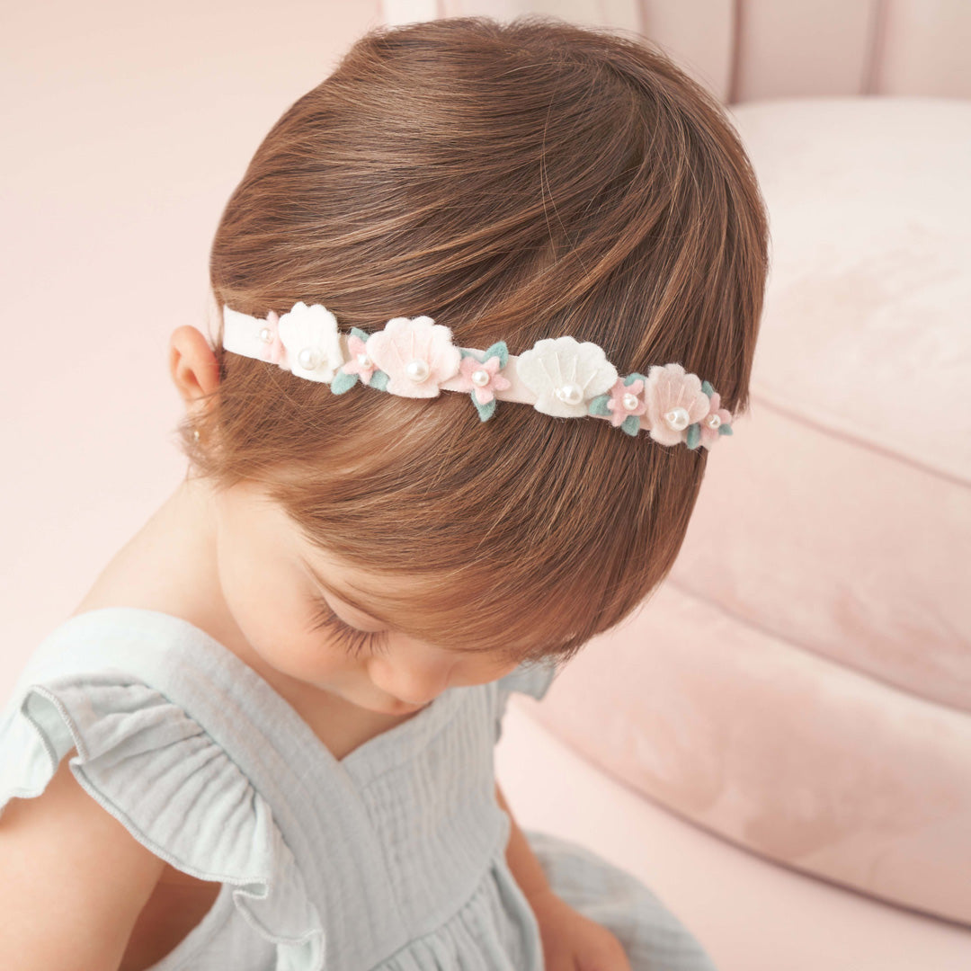 - Soft stretchy, tonal velvet headband with handmade felt flowers and shells, accented by mini pearls