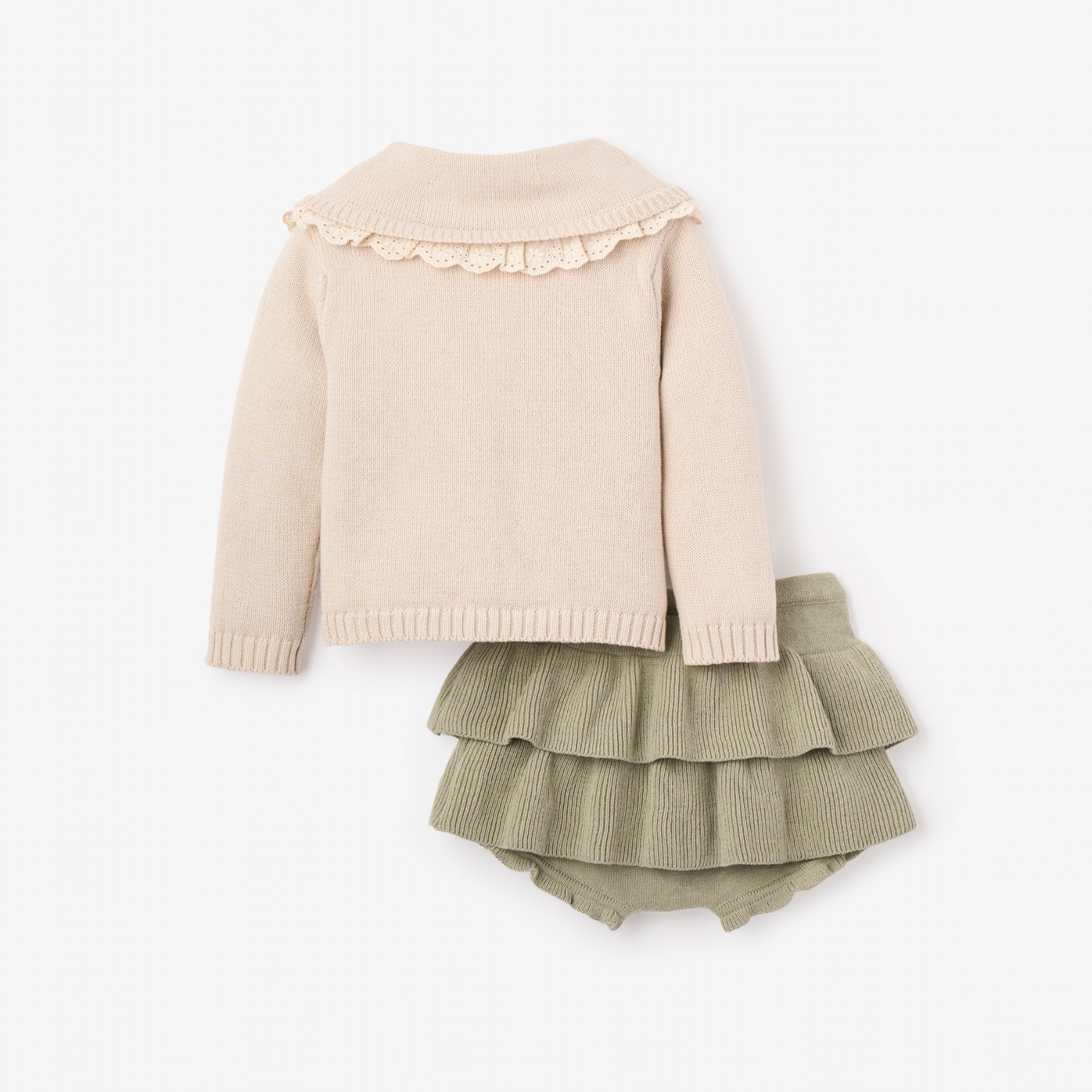 A refined pairing for special occasions, this knit sweater features a delicately embroidered collar and coordinating skirt. Designed with timeless elegance and easy softness in mind.