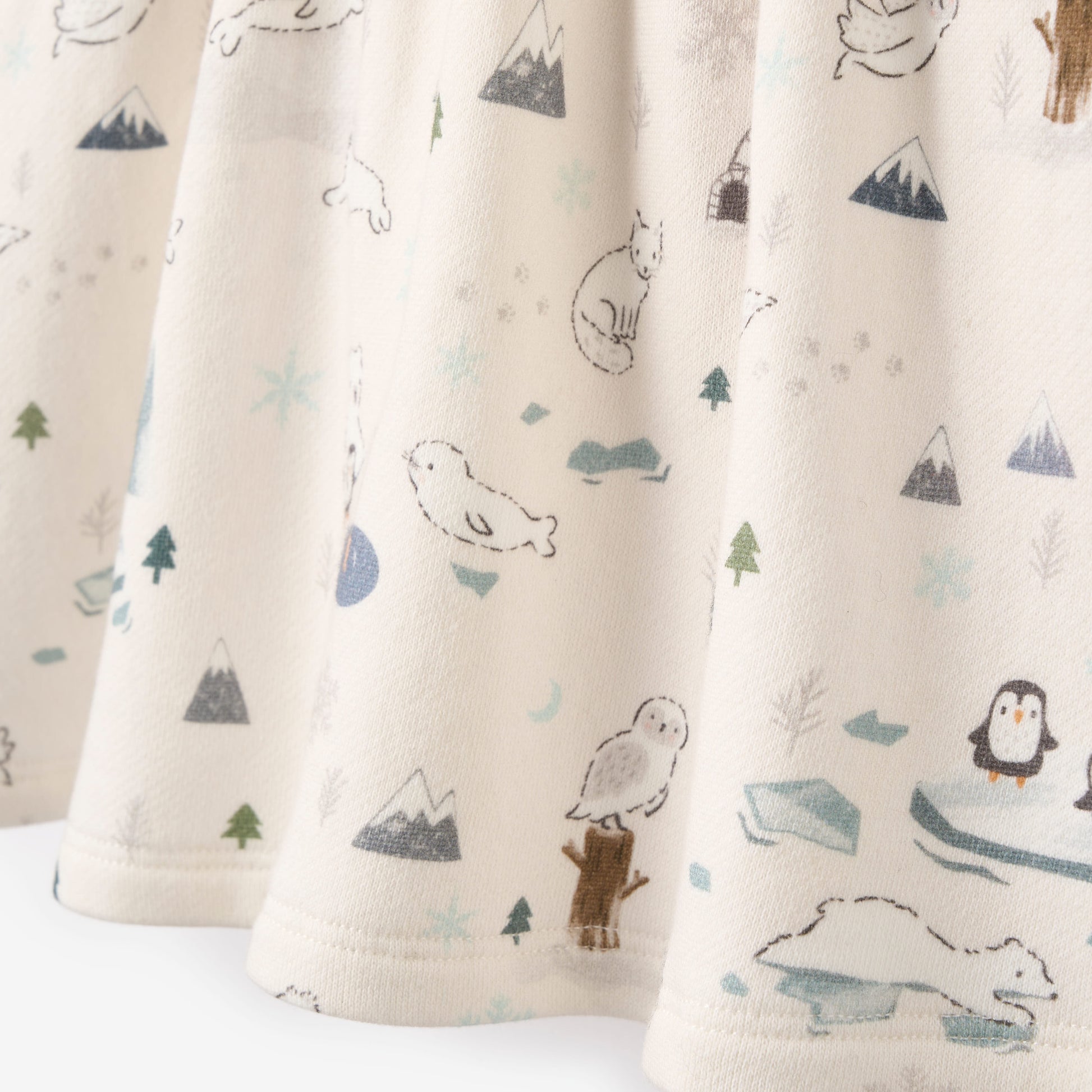 little one in whimsical warmth with our Arctic-printed fleece dress and cream