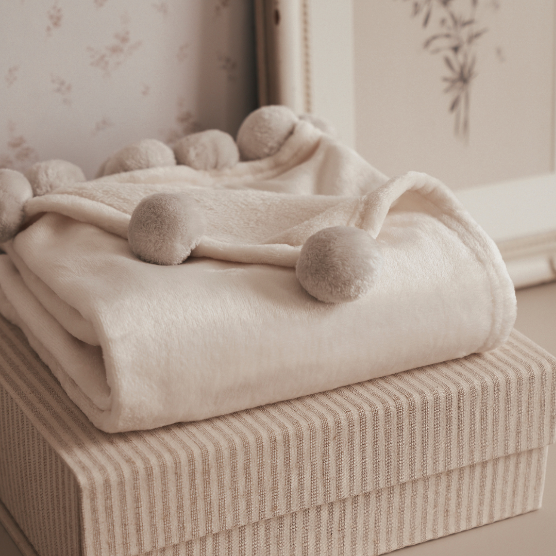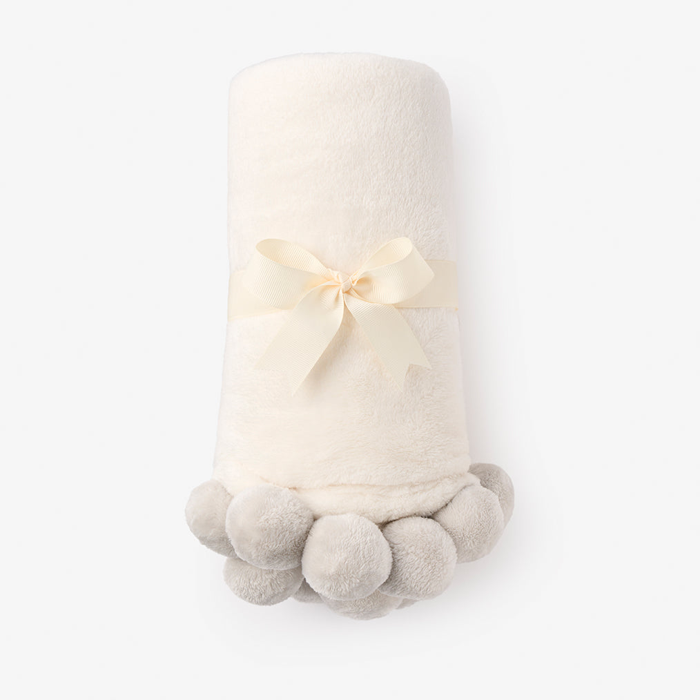 Our Pom Trim Fleece Baby Stroller Blanket is as warm and snuggly as it is durable, sure to become baby's favorite blanket. Lovingly made with mid-weight 100% soft polyester fleece, our cream-colored stroller baby blanket has adorable pom poms lining its end edges and is delivered folded and tied with a ribbon for easy gifting. It's machine washable and durable, yet will stay soft for years to come.