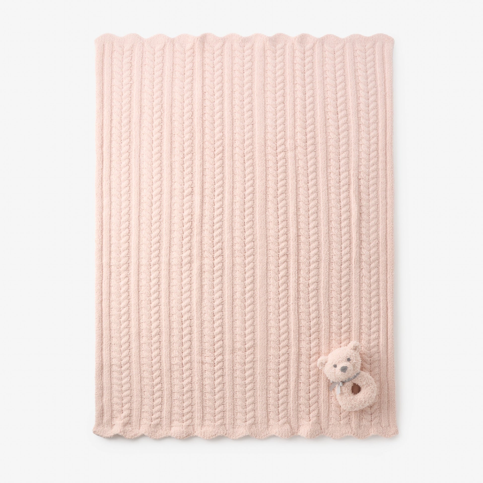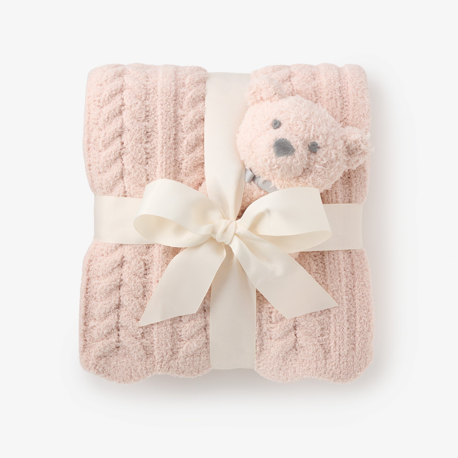 A timeless gift, reimagined in the softest textures. This beautifully bundled set features a plush feather knit chenille blanket with a classic cable design and a coordinating bear rattle—tied with a bow and ready for gifting. Available in pale pink, blue, and cream for the perfect welcome to baby.