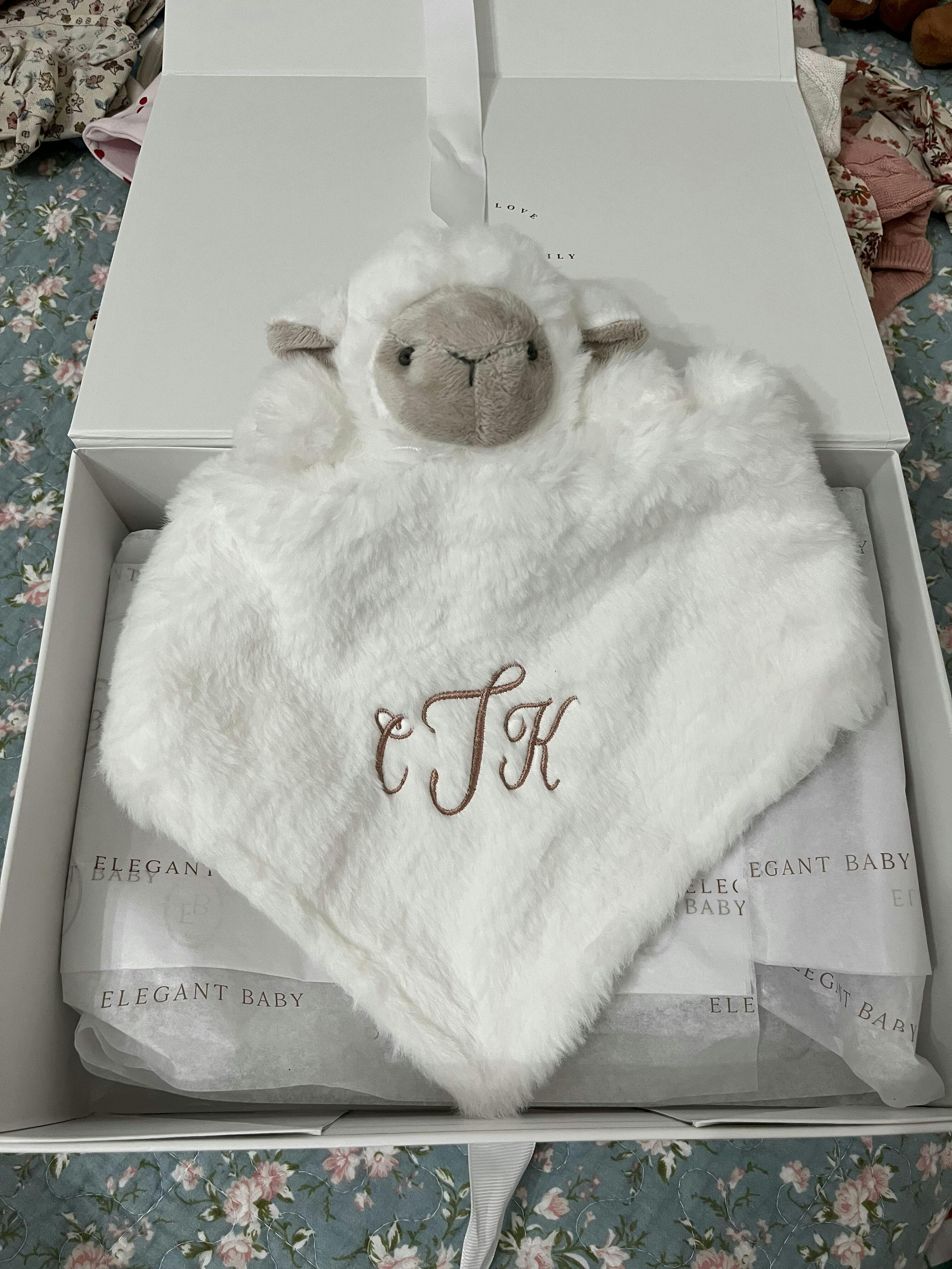 The plush lamb baby security blanket is adorable and amazingly soft. It is the perfect size for baby’s hands to hold and the lamb’s little face is so sweet. It is even more beautiful than the online pictures. Perfect choice, especially with the monogram option. Thank you!