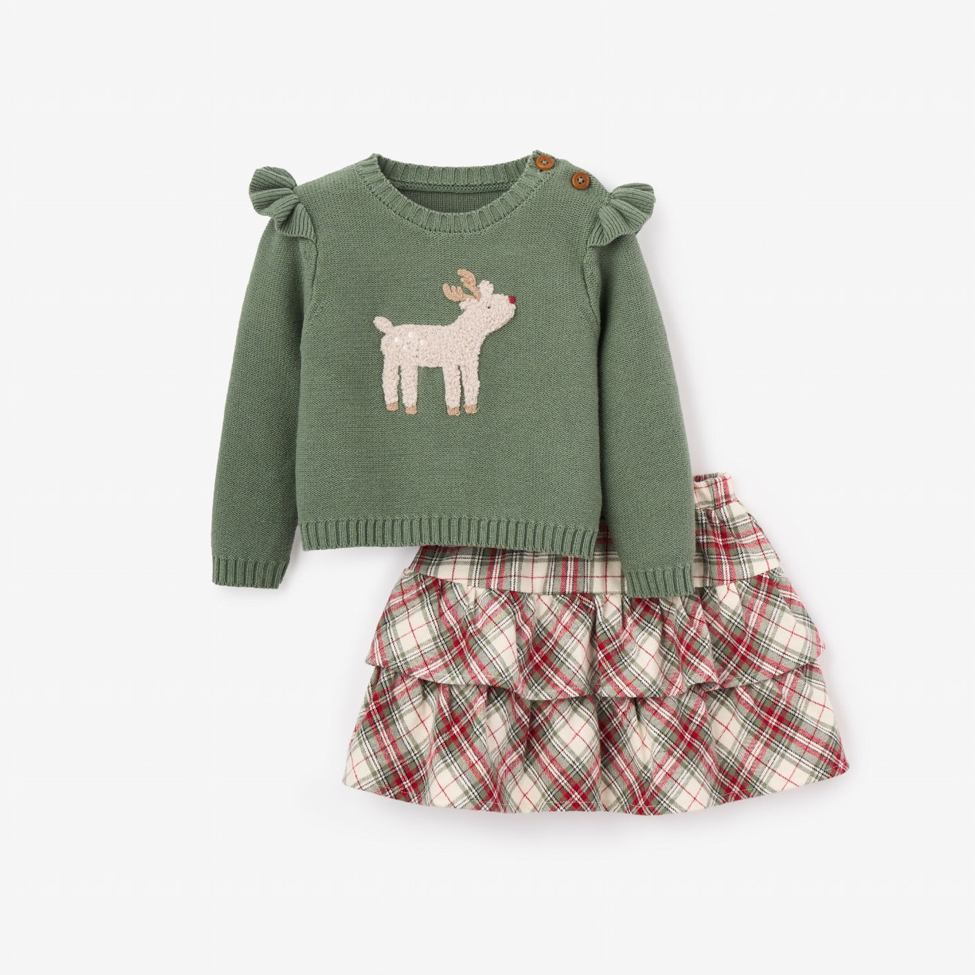 This charming holiday set features a reindeer sweater in soft seasonal hues, paired with a twirl-worthy winter tartan skirt. A picture-perfect outfit for gatherings, celebrations, and fireside memories.