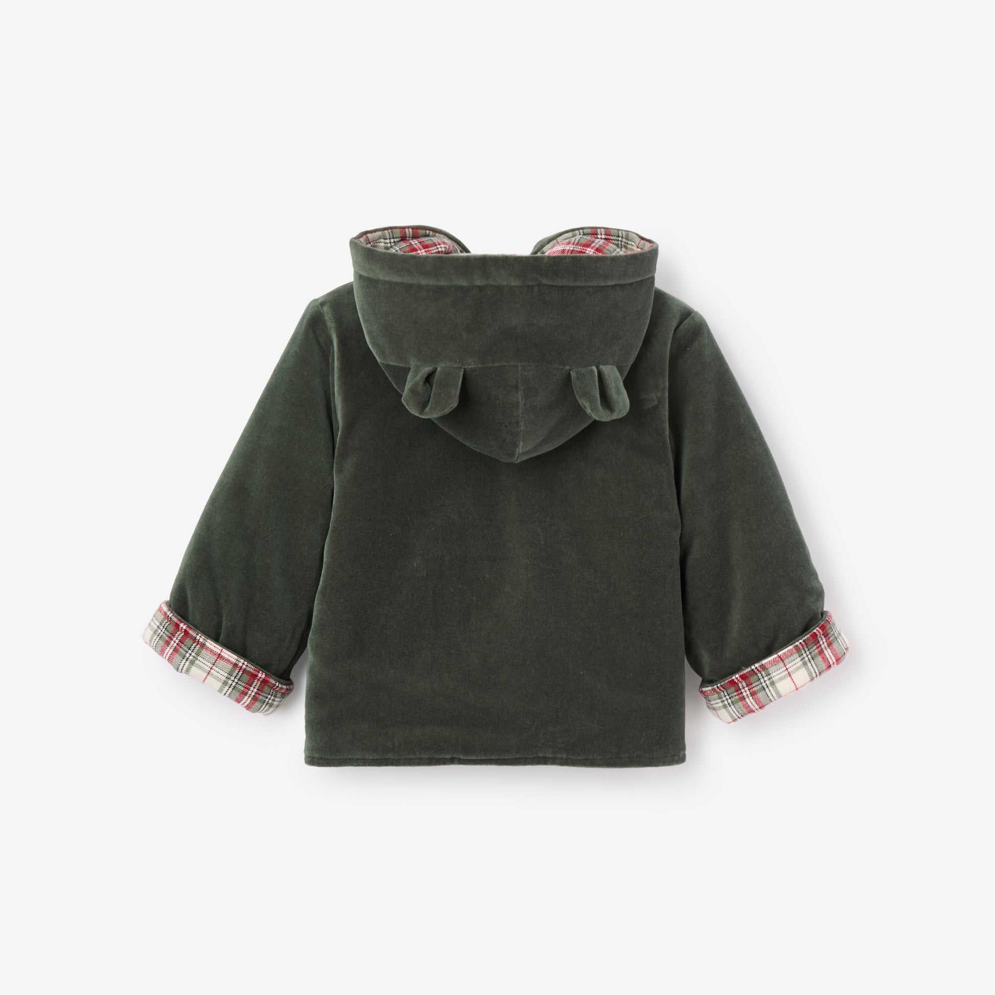 Two looks, one luxurious layer. This reversible coat features rich velvet on one side and classic winter tartan on the other, offering warmth and elegance no matter how the day unfolds. A cozy companion for snowy strolls and seasonal outings.