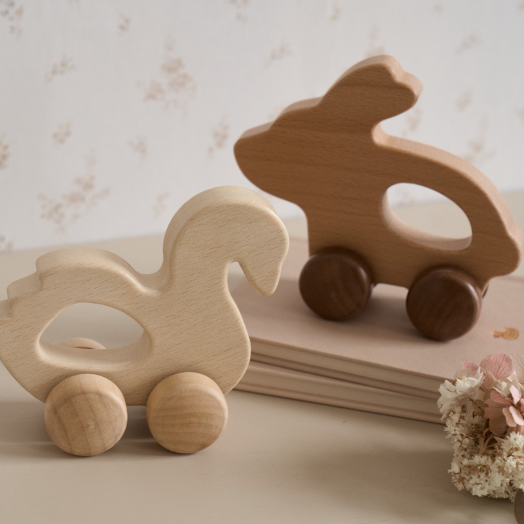 This adorable bunny features soft colors and easy-rolling wheels, perfect for little hands to push and pull. A delightful blend of fun and function, it encourages motor skill development and imaginative play, making it a perfect gift for any nursery or playroom. A beautiful keepsake for years to come.